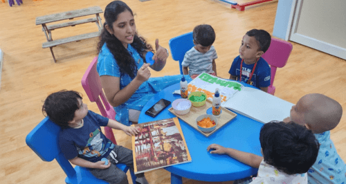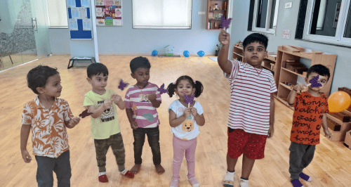 At this age children use their senses to explore the world, hence we have play based learning activities along with sensorial, cognitive and emotional learning.